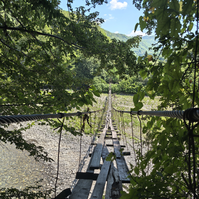 6. Адреналин и восторг: Переход по пешеходному подвесному мосту через бурную Шахе — почувствуйте вибрацию и мощь горной реки под ногами!