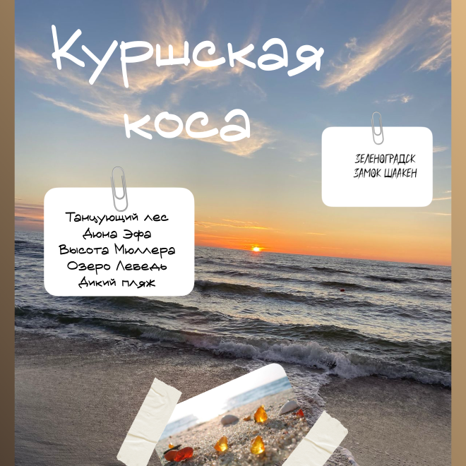 Приглашаем вас в незабываемое путешествие на Куршскую косу. Национальный парк международного значения, признанный объектом всемирного наследия ЮНЕСКО. Примечательная песчаная полоса между двумя водными пространствами поражает воображение своими гигантскими дюнами, разнообразием флоры и фауны. Каждый гость почувствует единение с природой, ощутив свободу ветра и солёный запах моря.