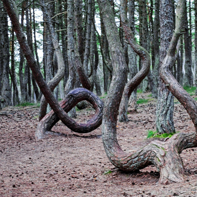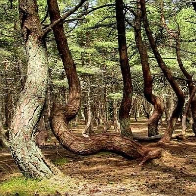 2. Танцующий лес. Главной особенностью Танцующего леса являются сосны, стволы которых изогнуты, напоминают танцующие фигуры. Деревья, словно под влиянием невидимого ритма, качаются и изгибаются, создавая загадочную и волшебную атмосферу. Стволы деревьев танцуют в разных направлениях, что создает чувство движения и динамики в лесу. Это природное искусство впечатляет и вызывает восхищение.